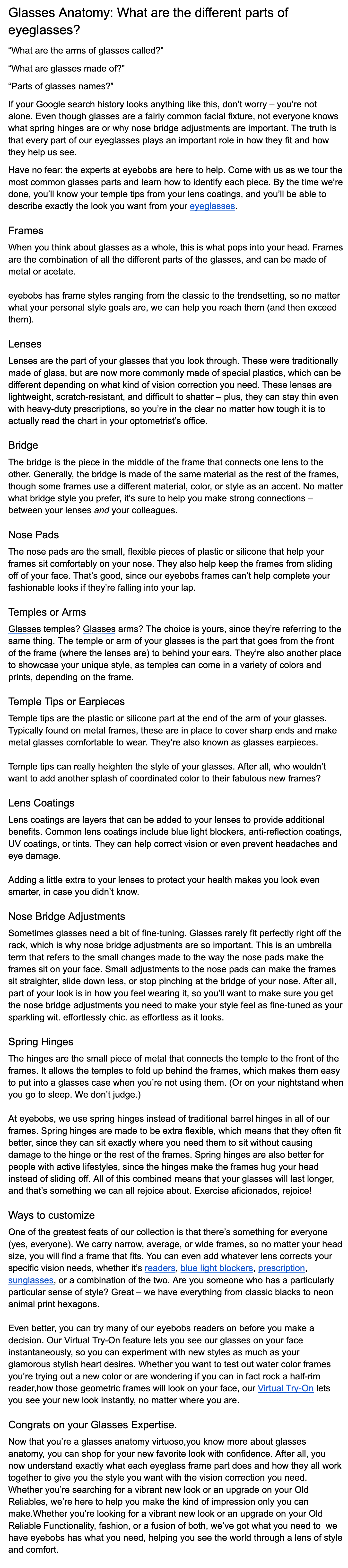 eyebobs, a boutique eyewear company with a unique voice, needed a blog post explaining the names and functions of all the parts of a pair of glasses. They provided a long list of terms to include and keywords to focus on. The post was meant to boost organic search results based on the keywords they provided.