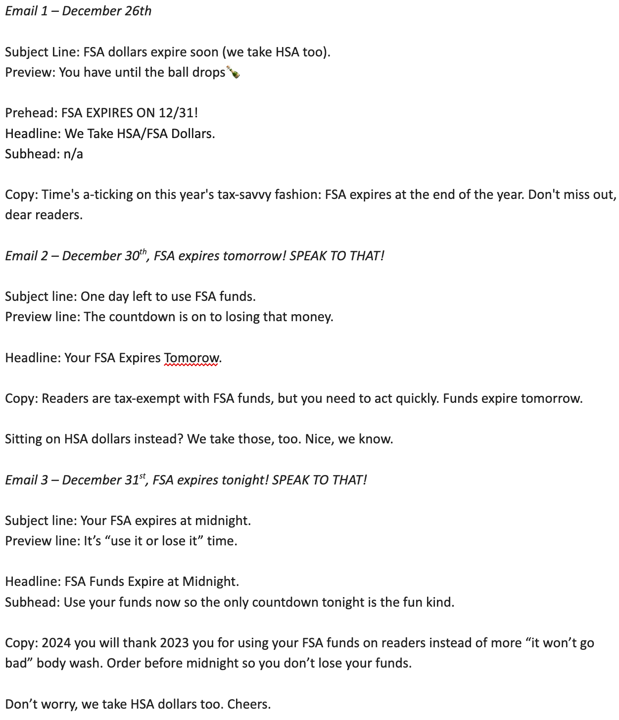 eyebobs, a fashion eyewear company with a unique brand voice, wanted an end-of-year email series to let subscribers know that FSA dollars could be spent in their online store. These emails were meant to drive purchases in the post-holiday period, capitalizing on the fact that FSA money expires.