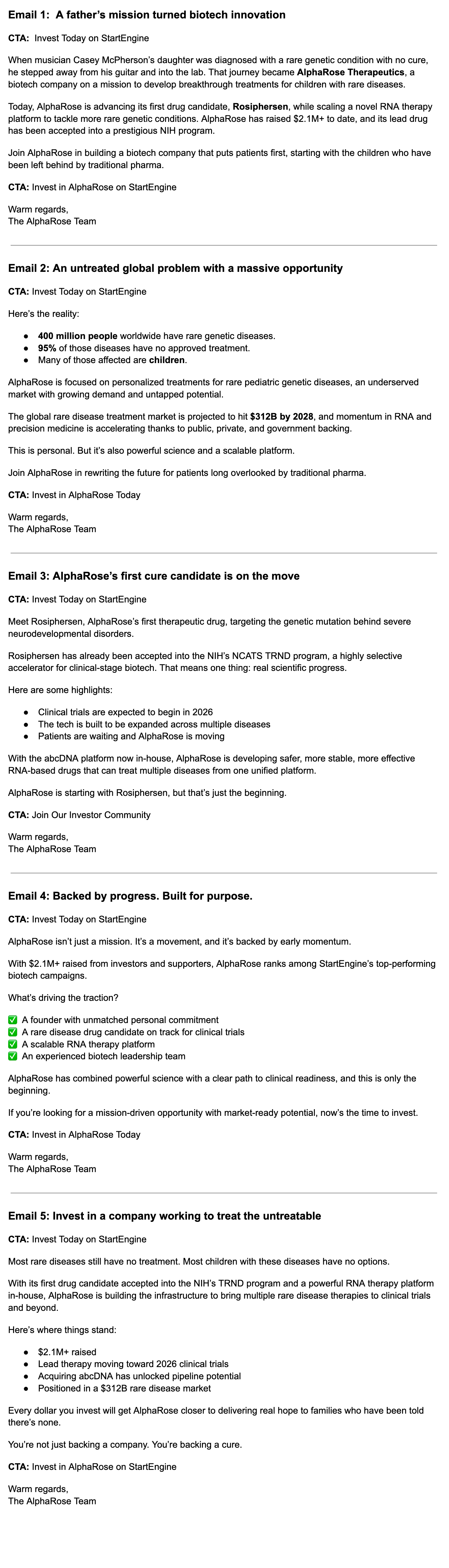 AlphaRose is a company working on new treatments and possible cures for rare genetic diseases. As part of their equity crowdfunding campaign, they needed a series of five emails to send to potential investors, introducing their company and giving reasons to invest.
