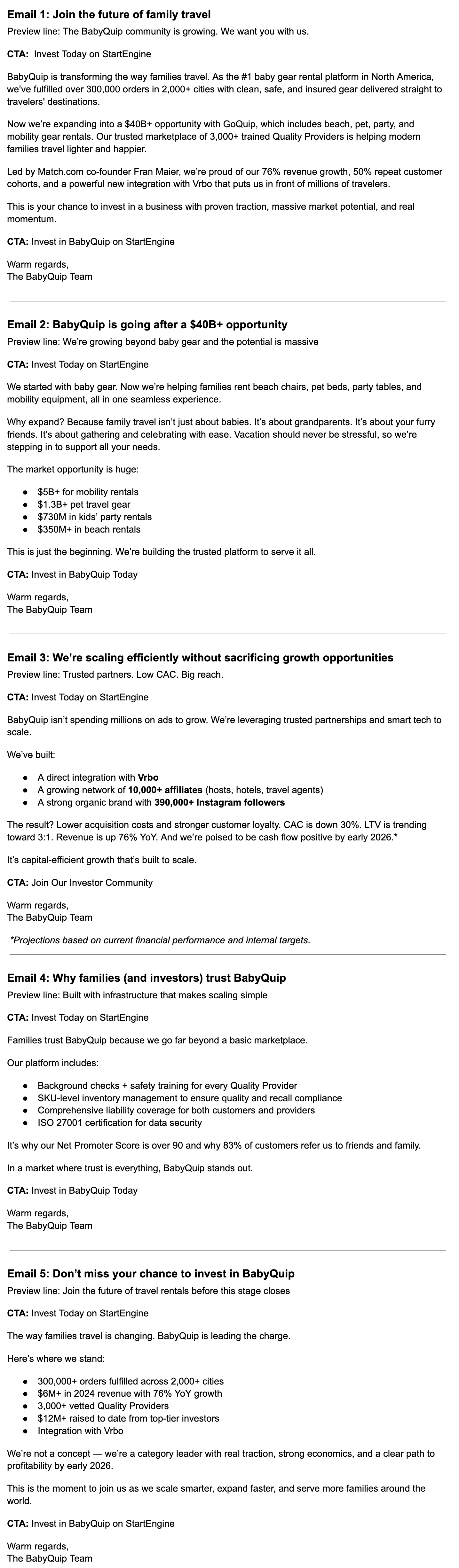 BabyQuip is a company that offers gear rentals for families on vacation. As part of their expansion into verticals outside of baby gear (mobility gear, pet rentals, etc.), they needed a series of five emails to send to potential investors, introducing their company and giving reasons to invest.