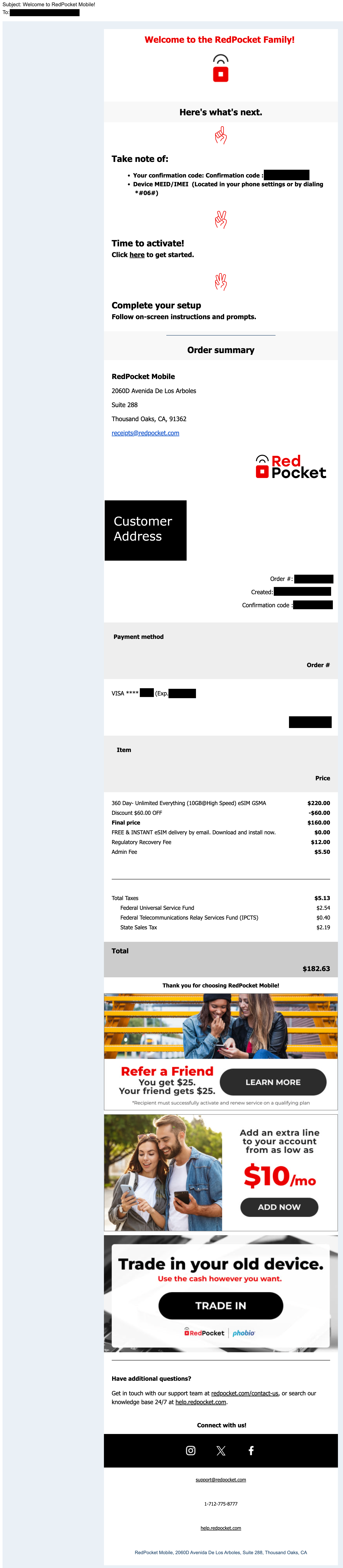 RedPocket Mobile, a cell phone company, needed an email to let new customers know that their purchase went through. The email needed to be warm and congratulatory while also letting customers know what their next steps would be. It also needed to spotlight upsells and promotions at the end.
