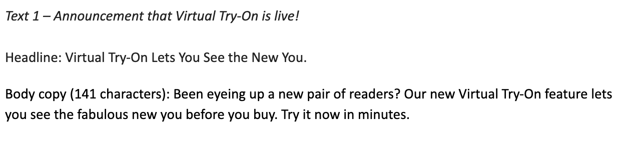 eyebobs, a fashion eyewear company with a unique brand voice, launched a Virtual Try-On feature on their website. They wanted an SMS message to send to subscribers announcing the new feature.