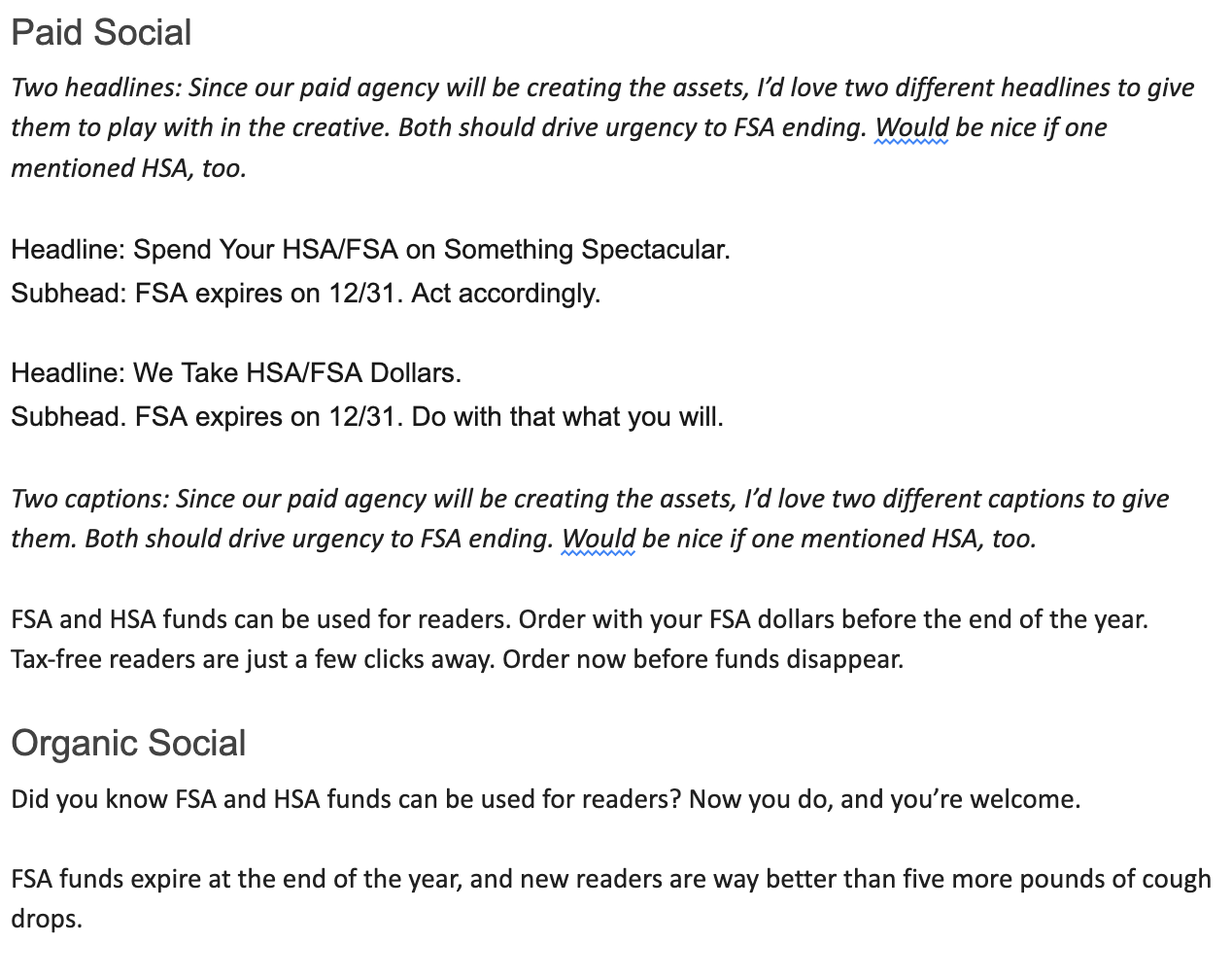 eyebobs, a fashion eyewear company with a unique brand voice, wanted a set of paid social and organic social posts to let subscribers know that FSA money could be spent at their online store. This campaign was meant to get people to spend their money at eyebobs at the end of the year, using urgency messaging to get people to convert.