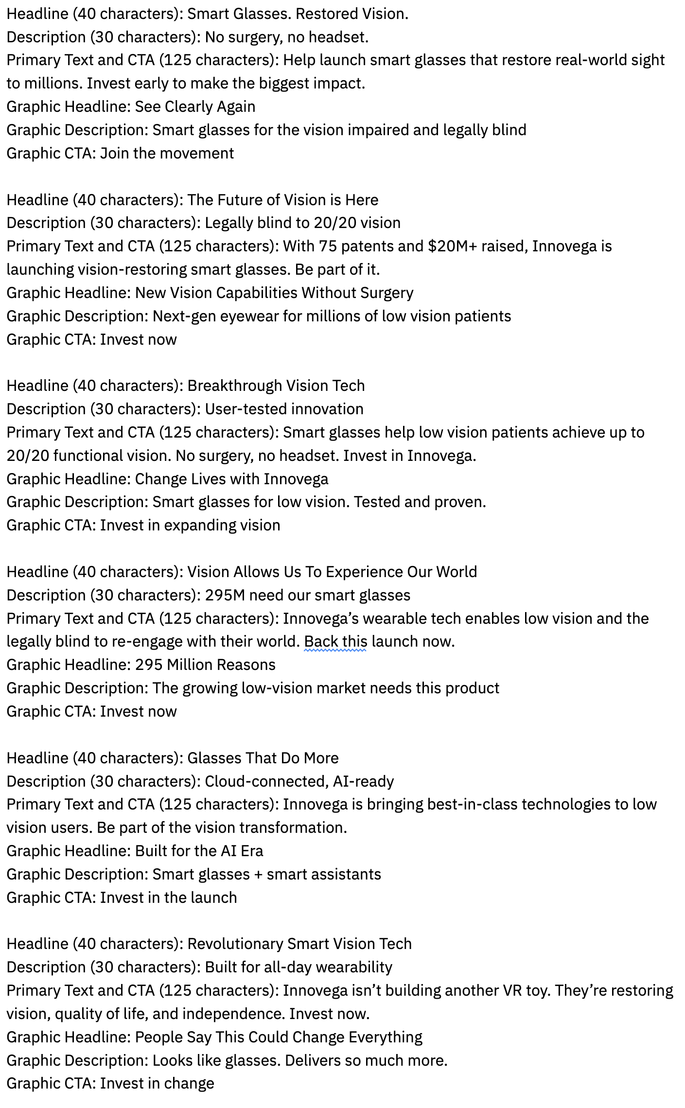 Innovega is a medical technology company focused on creating smart glasses to bring 20/20 vision back to people with severe vision loss. They needed a set of ads for Meta encouraging people to invest in their equity crowdfunding campaign.