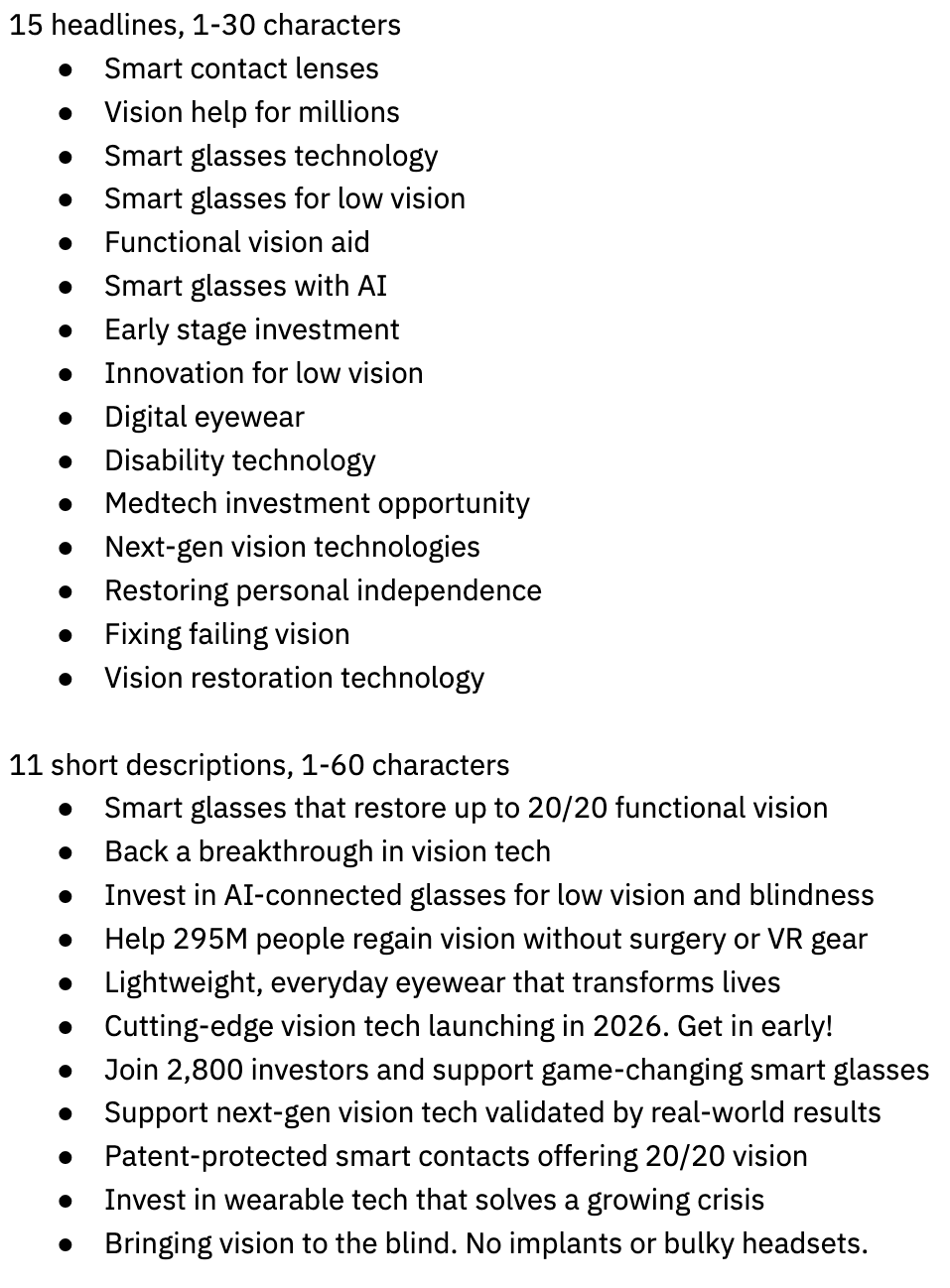 Innovega, a vision technology company, needed a set of headlines and descriptions to use in a Google PMAX campaign. They wanted to introduce people to their smart glasses that restore 20/20 vision to patients with severe vision loss and enourage them to invest.