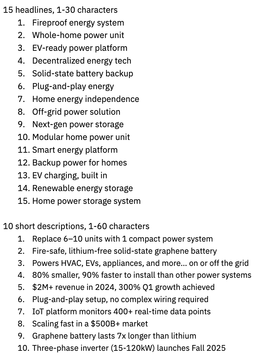 Paladin Power is produces whole-home energy storage solutions. They needed a set of headlines and descriptions to use in a Google PMAX campaign aimed at bringing new investors to their equity crowdfunding campaign.