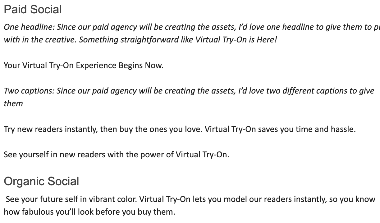 eyebobs, a fashion eyewear company with a unique brand voice, wanted to let their social subscribers know about a new feature on their website. They needed both paid social and organic social posts to tell people about the Virtual Try-On program.